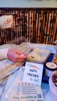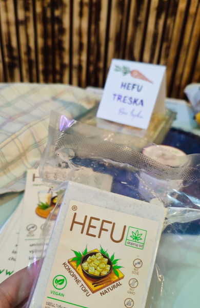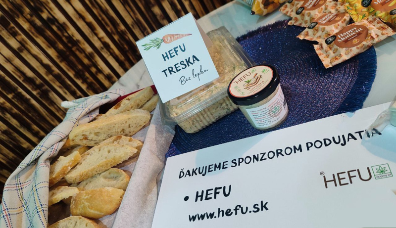 Tentokrát sme chceli experimentovať a pripraviť menej obvyklé jedlo Miso polievku s ryžovými rezancami, vhodnú aj pre celiatikov. Pri bezlepkových jedlách ešte ostaneme. Ľudia mali na výber bezlepkové domáce pečivo, kokosové guľky a našu špecialitu vegán tresku, ktorú sme vďaka podpore HEFU mohli pripraviť výnimočne z konopného tofu, ktoré je bohaté na OMEGA 3 mastné kyseliny. Je to skvelá alternatíva rýb pre tých, ktorí nejedávajú mäso a ich životný štýl je vegetariánska či vegánska strava. Spolu s našou tekvicovou bábovkou mala práve táto alternatíva tresky najväčší ohlas. Okrem konopného tofu nám pán Mitter z HEFU poslal aj ich originálne nátierky, ktoré si účastníci mohli natrieť na náš domáci chlebík. HEFU je výnimočné nielen svojím vysokým obsahom proteínov a zdravých tukov, ale aj svojou neuveriteľnou chuťou. Je skvelou alternatívou pre tých, ktorí sú alergickí na sóju. Všetky tieto produkty nájdete na stránke Hefu.sk